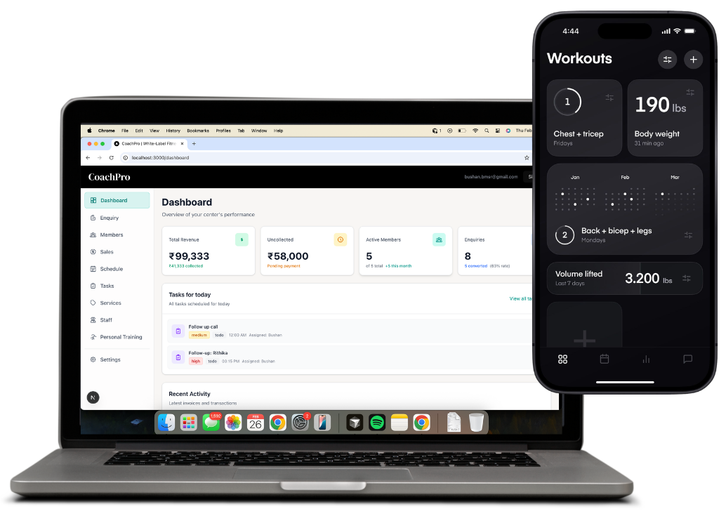 You run the business on the web; trainers and clients live in the app. Same data, seamless experience.